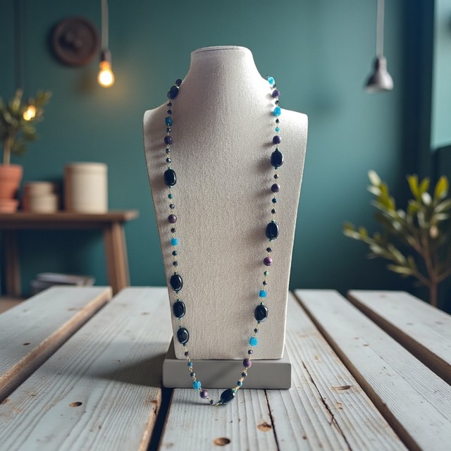 HNTK 天然石ブルー&ブルーロングネックレス N0753