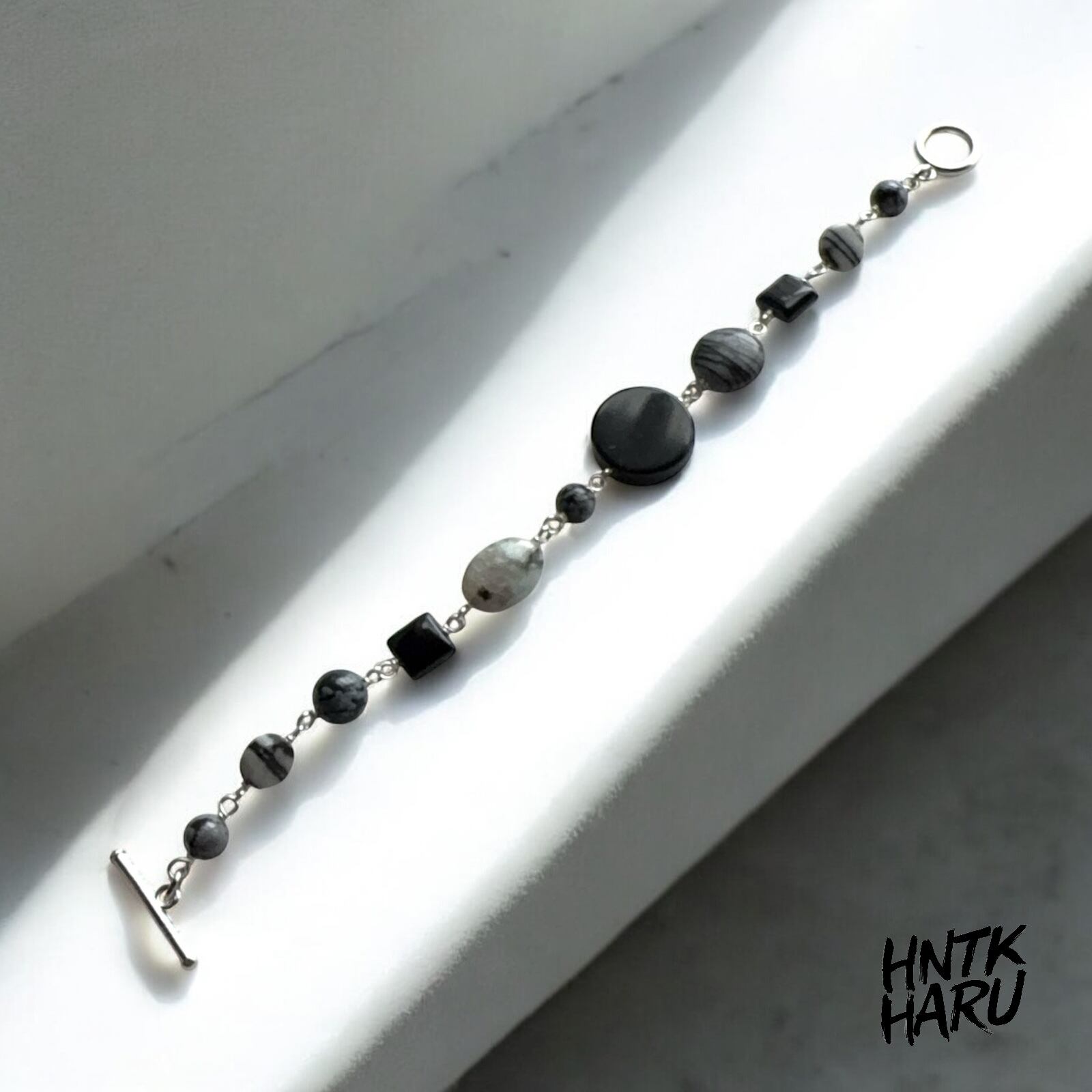 この商品は、オニキス、セサミジャスパー、ゼブラジャスパー、スノーフレークオブシディアンが組み合わさり、独特のデザインに仕上げられているため、さまざまなスタイルにもフィットし、カジュアルからフォーマルな場面まで大活躍することが期待できます!