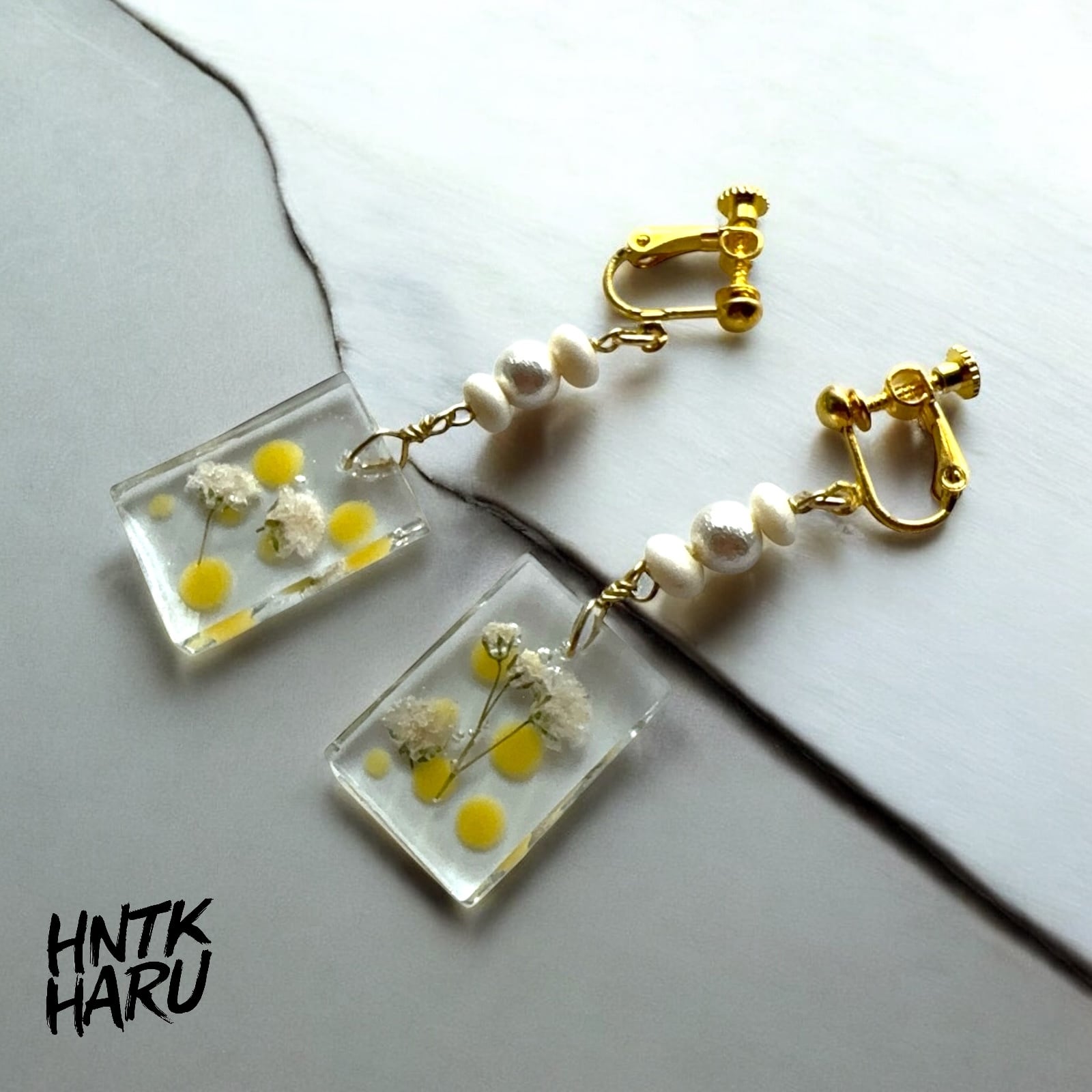 HNTK レジンかすみ草&パール イヤリング P0434は、淡い色合いのかすみ草がレジンに封じ込められた、ナチュラルで魅力的なアクセサリーです。