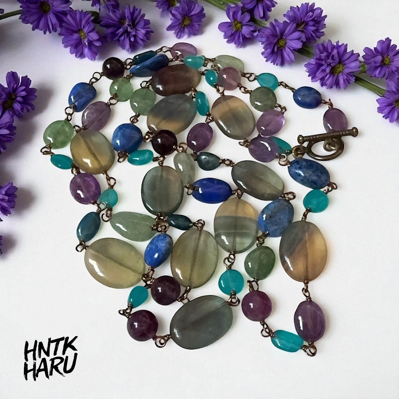 HNTK オリエンタルカラー ロングネックレス N0681は、魅力的なオリエンタルカラーのロングネックレス。フローライト、アパタイト、ラピスラズリ、アメジストを使用した美しいアクセサリーです。