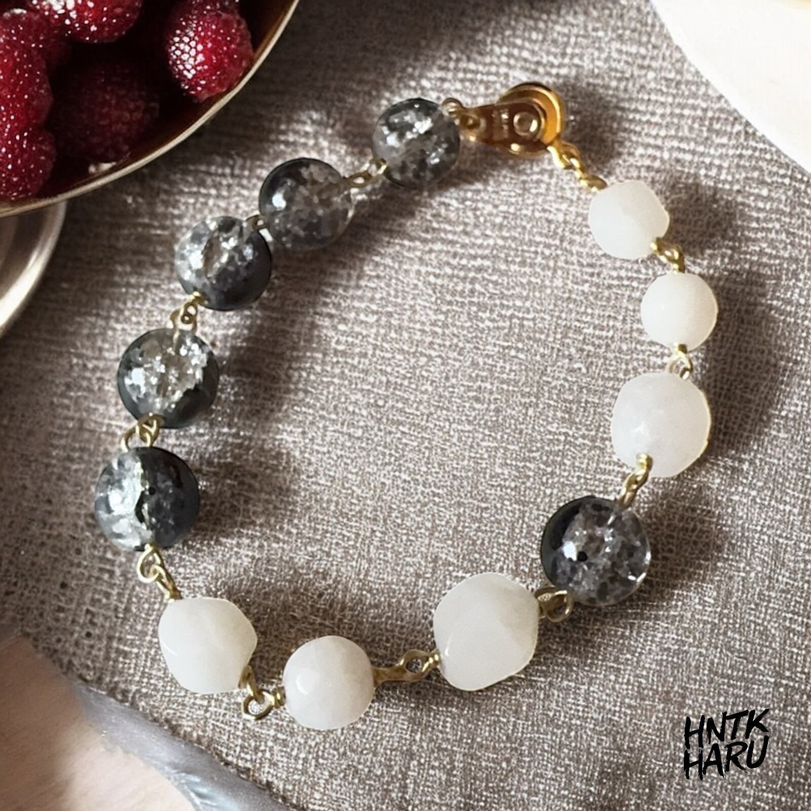 HNTK クラックガラスビーズ&ホワイトジェイド ブレスレット B0177は、美しいクラックガラスビーズと純白のホワイトジェイドを組み合わせた魅力的なアクセサリーです。