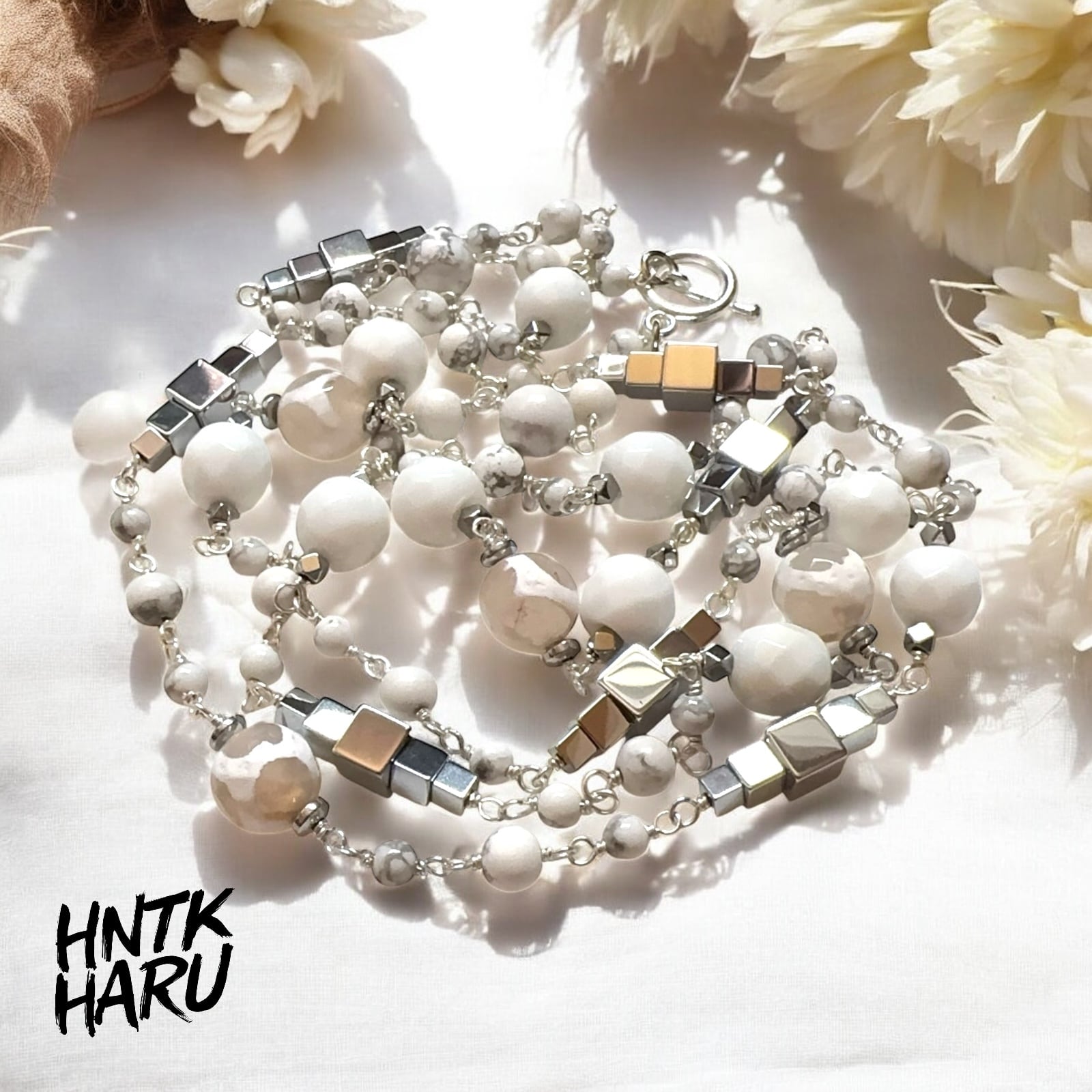 HNTK 白瑪瑙&シルバーヘマタイト ロングネックレス N0784は、清らかな白瑪瑙とシルバーヘマタイトを使用した洗練されたアクセサリーです。
