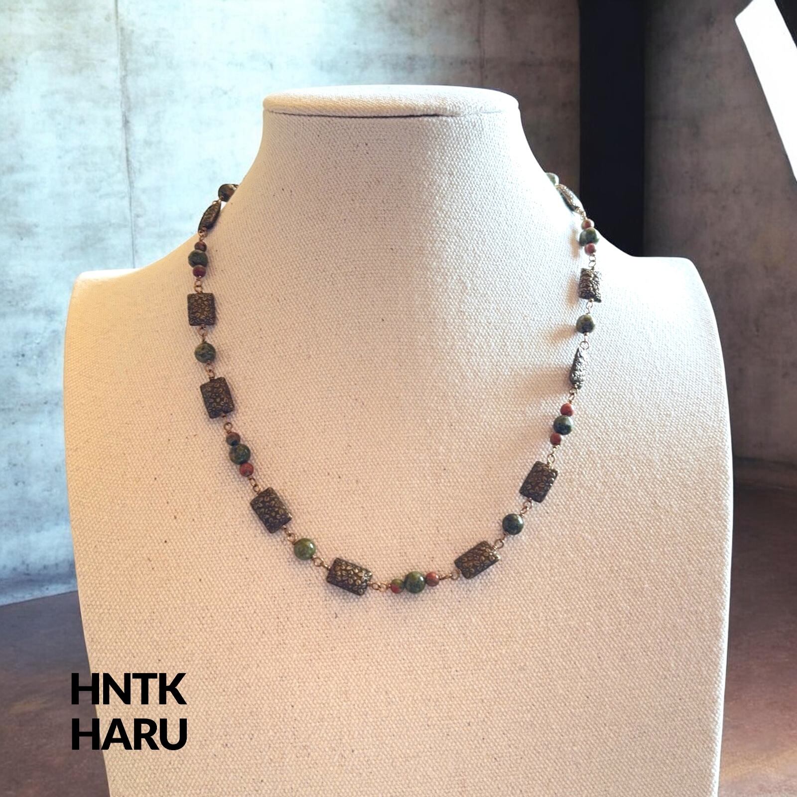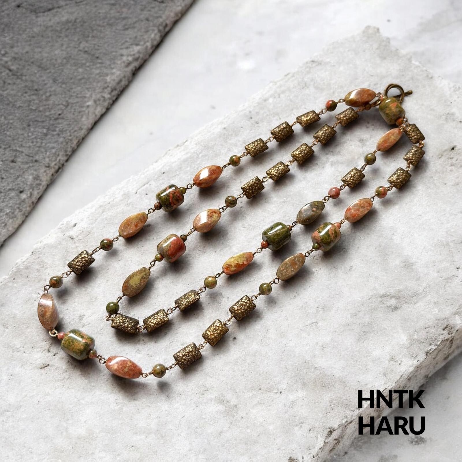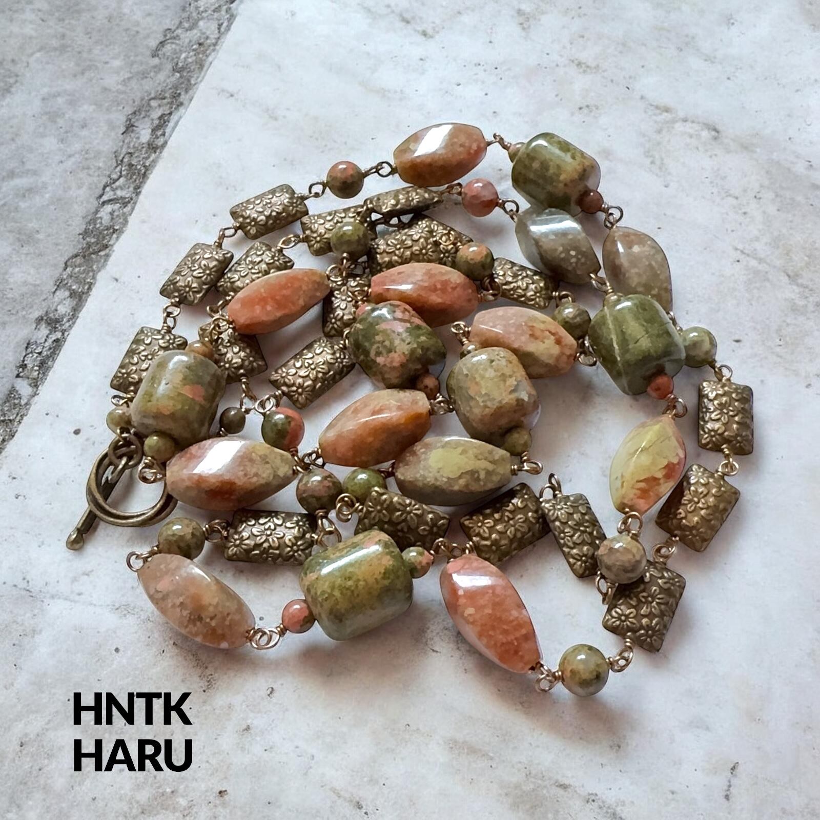 HNTK ユナカイト&メタルパーツ ロングネックレス2本セット N0811は、ユナカイトとメタルパーツを贅沢に使用した、アンティーク風の魅力が漂うアクセサリーです。