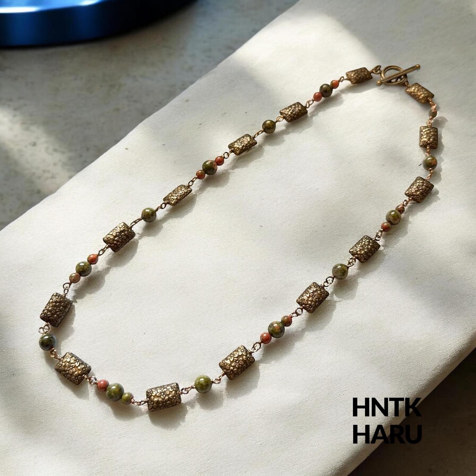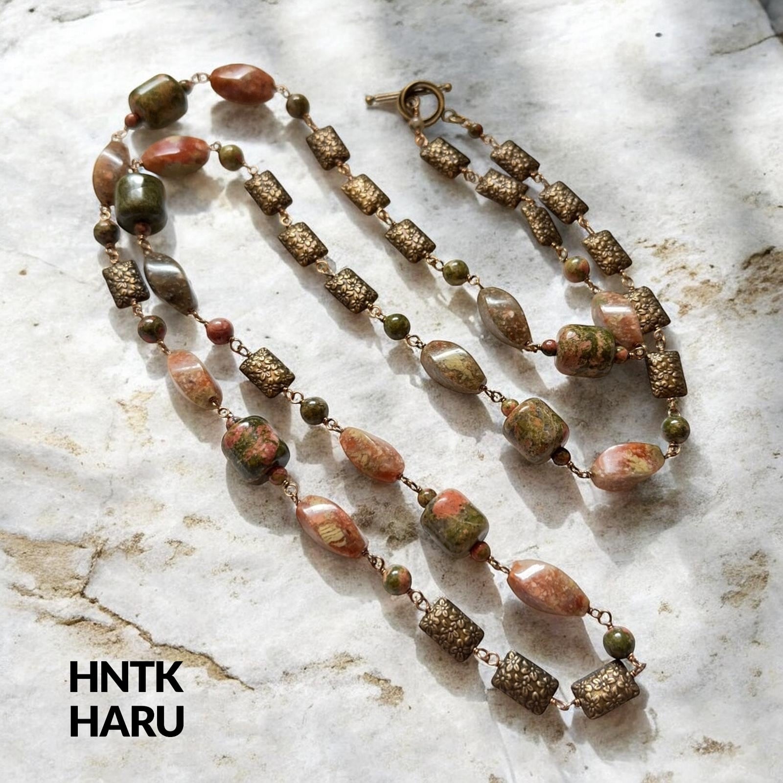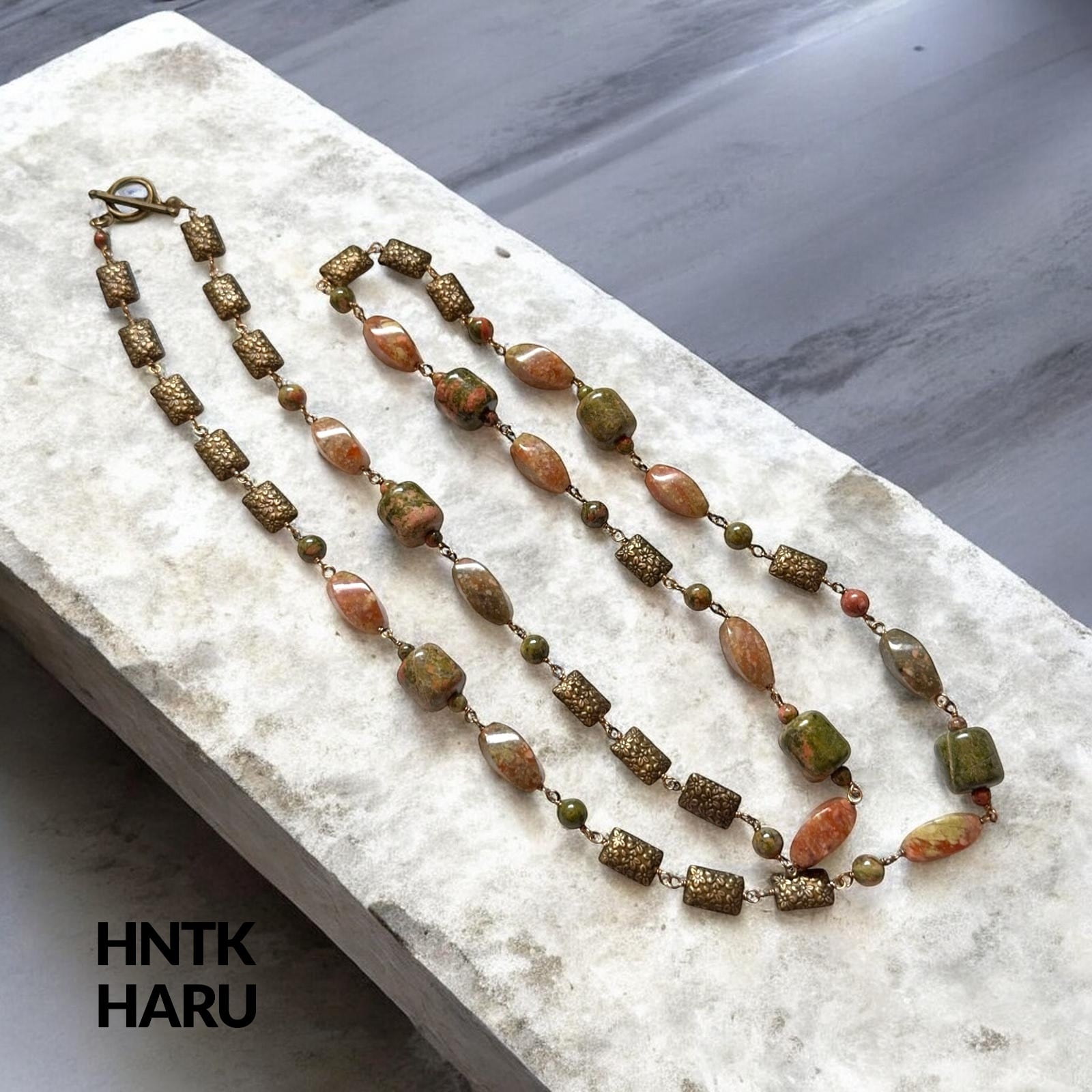 HNTK ユナカイト&メタルパーツ ロングネックレス2本セット N0811は、ユナカイトとメタルパーツを贅沢に使用した、アンティーク風の魅力が漂うアクセサリーです。