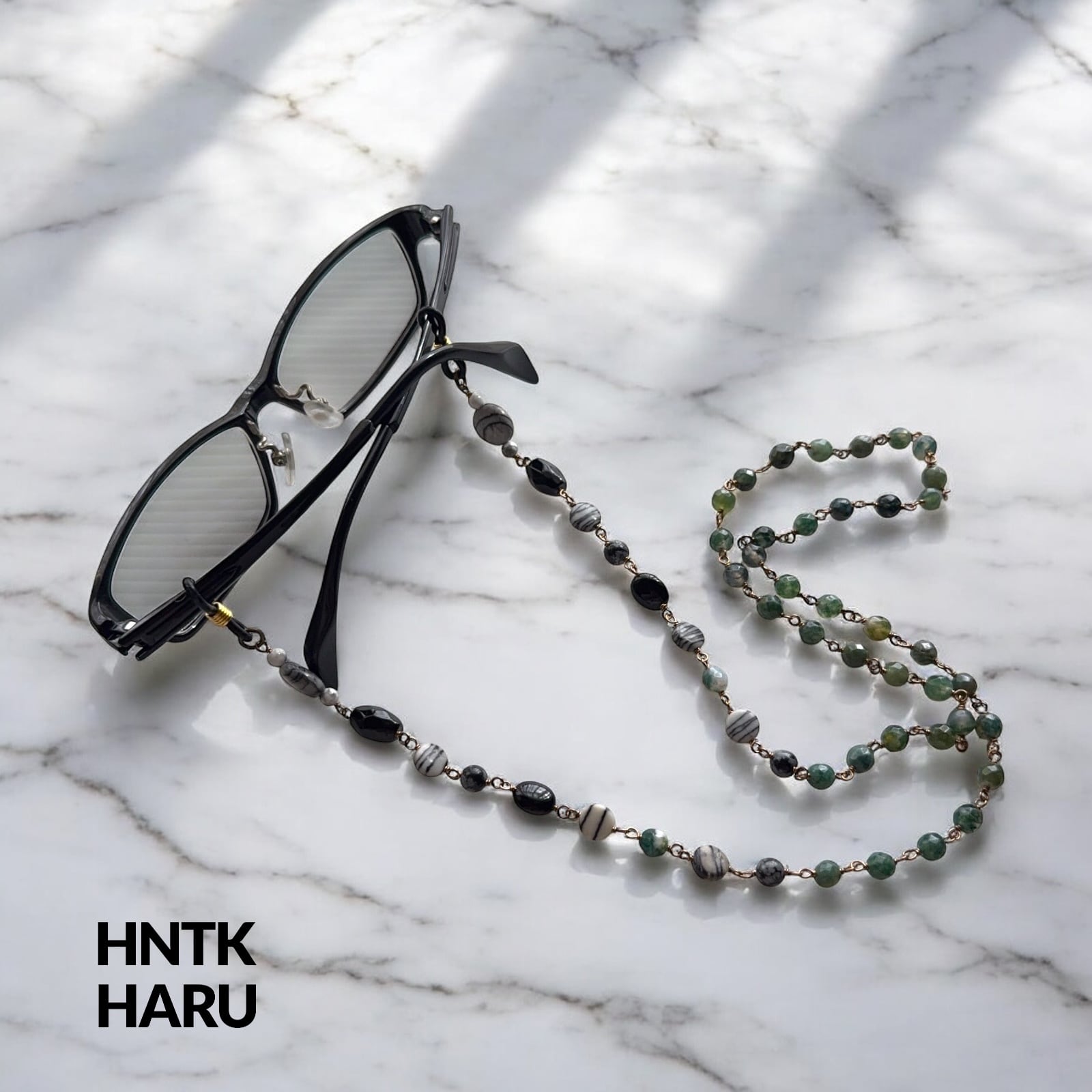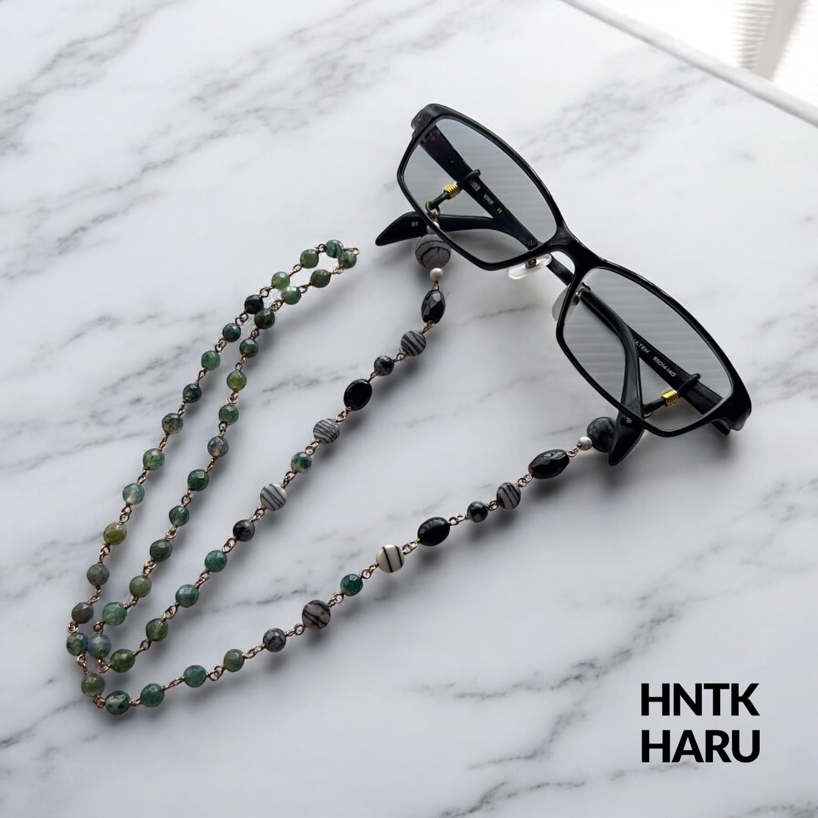 この機会に、HNTKのグリーンモスアゲート&ゼブラジャスパーメガネチェーンをぜひお試しください!