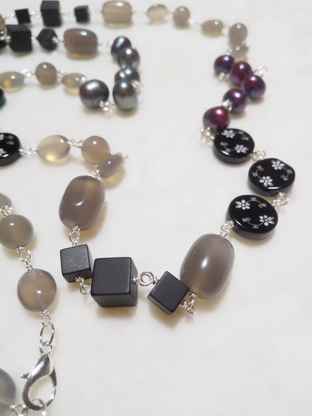 ラウンド、カットオーバル、チューブ、3種類のグレーオニキス。花の絵が描いてある、コイン形のオニキス、キューブ形のマットオニキス、7mmのボルドーカラーの淡水パール。