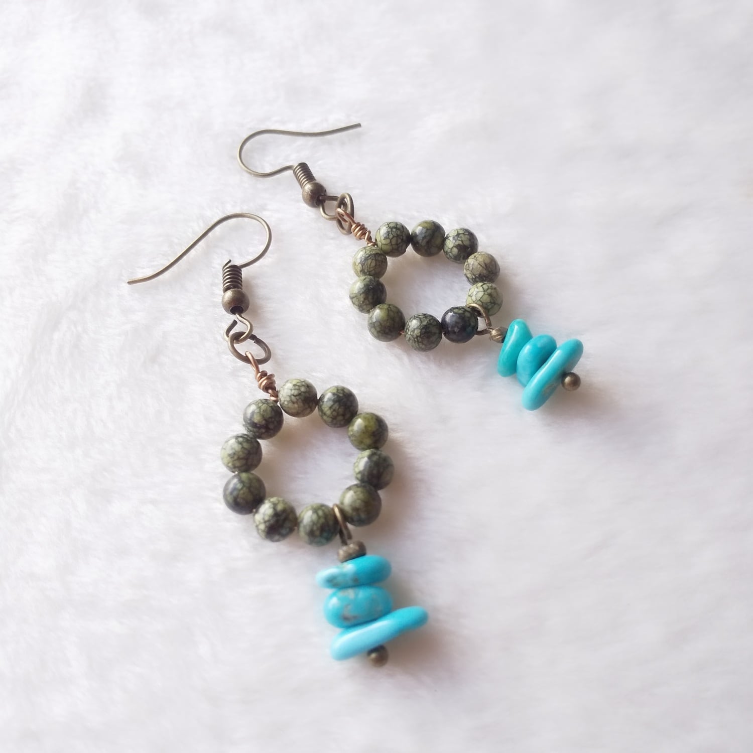 サーペンティンのリングは15mm、ターコイズのチップが揺れるイヤリングです。 イヤリングかピアスか選択をお願いします。 長さは約3.5cm