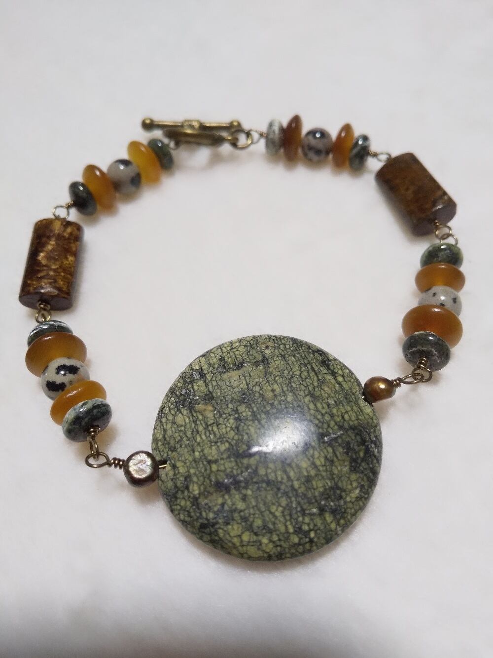 30mmの大きなサーペンティンにブロンザイトスティック、バッファローボーンにダルメシアンジャスパー。エスニックな感じのブレスレットです。