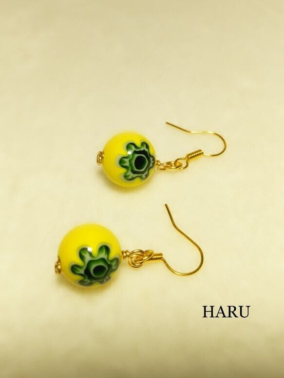 明るい黄色にグリーンのコントラストが、小さくてもインパクトのあるイヤリングです。イヤリング、ピアスどちらかを選択してください