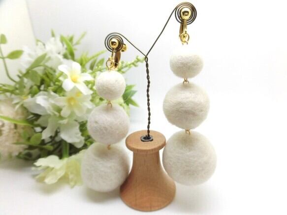 24㎜、20㎜、12㎜のフェルトボールがゆれるのがとても可愛く、存在感のあるイヤリングです。