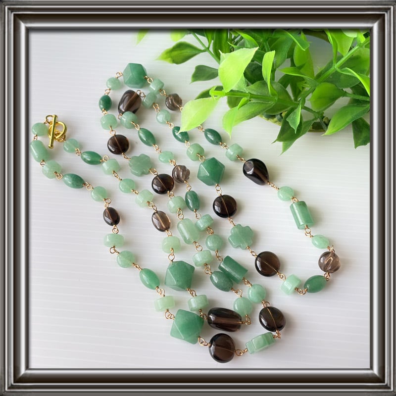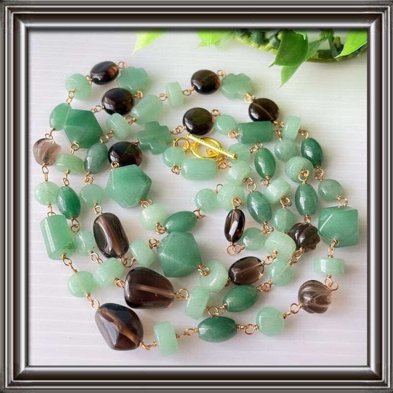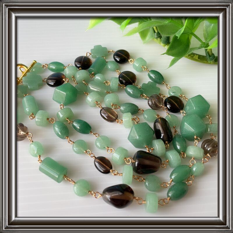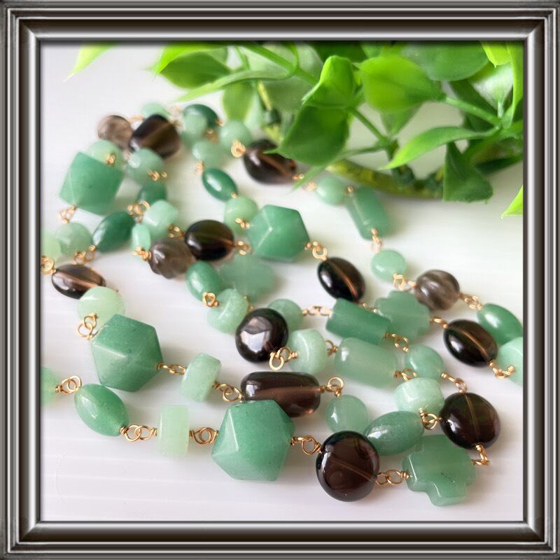 ナチュラルカラーの爽やかさのある、グリーンアベンチュリンに大地の色、スモーキークォーツ。