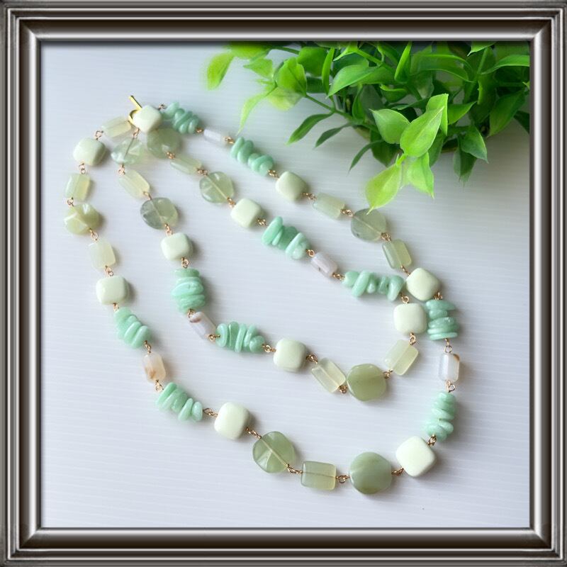 薄らグリーンかかったレモンクリソプレーズは、レトロ感のある石、同じグリーン系で、統一感。