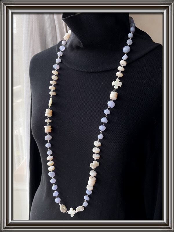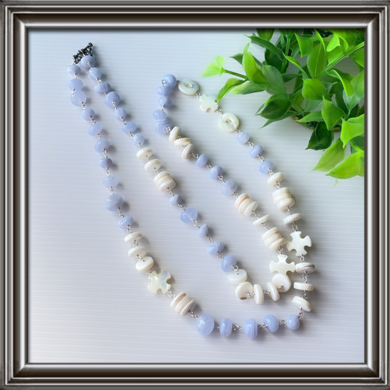 ペールブルーにホワイトのストライプ模様の入ったブルーレースアゲートはコロンとしたタンブル。ホワイトシェルをあわせて、清楚で清潔なイメージのネックレスです。