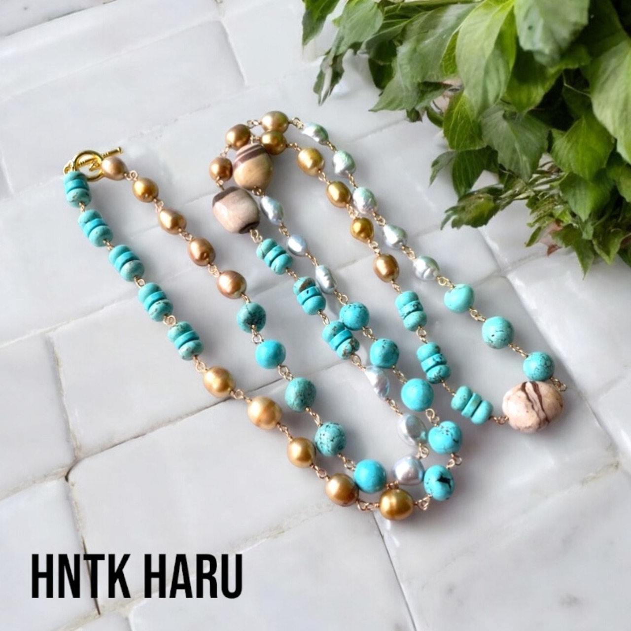 ゴールドやシルバーの淡水パールにマグネサイトターコイズで、カジュアルに気軽につけて頂けるネックレスです。