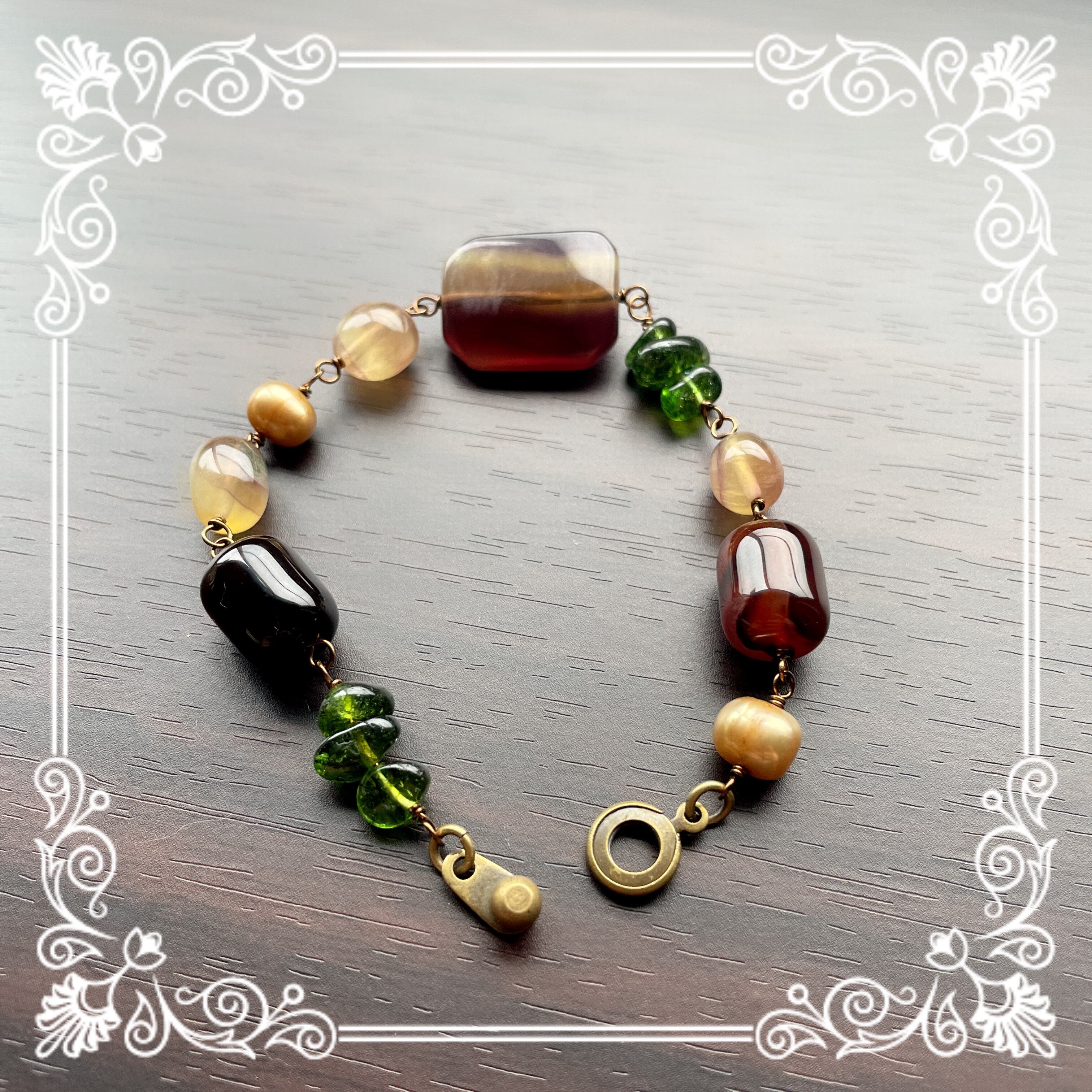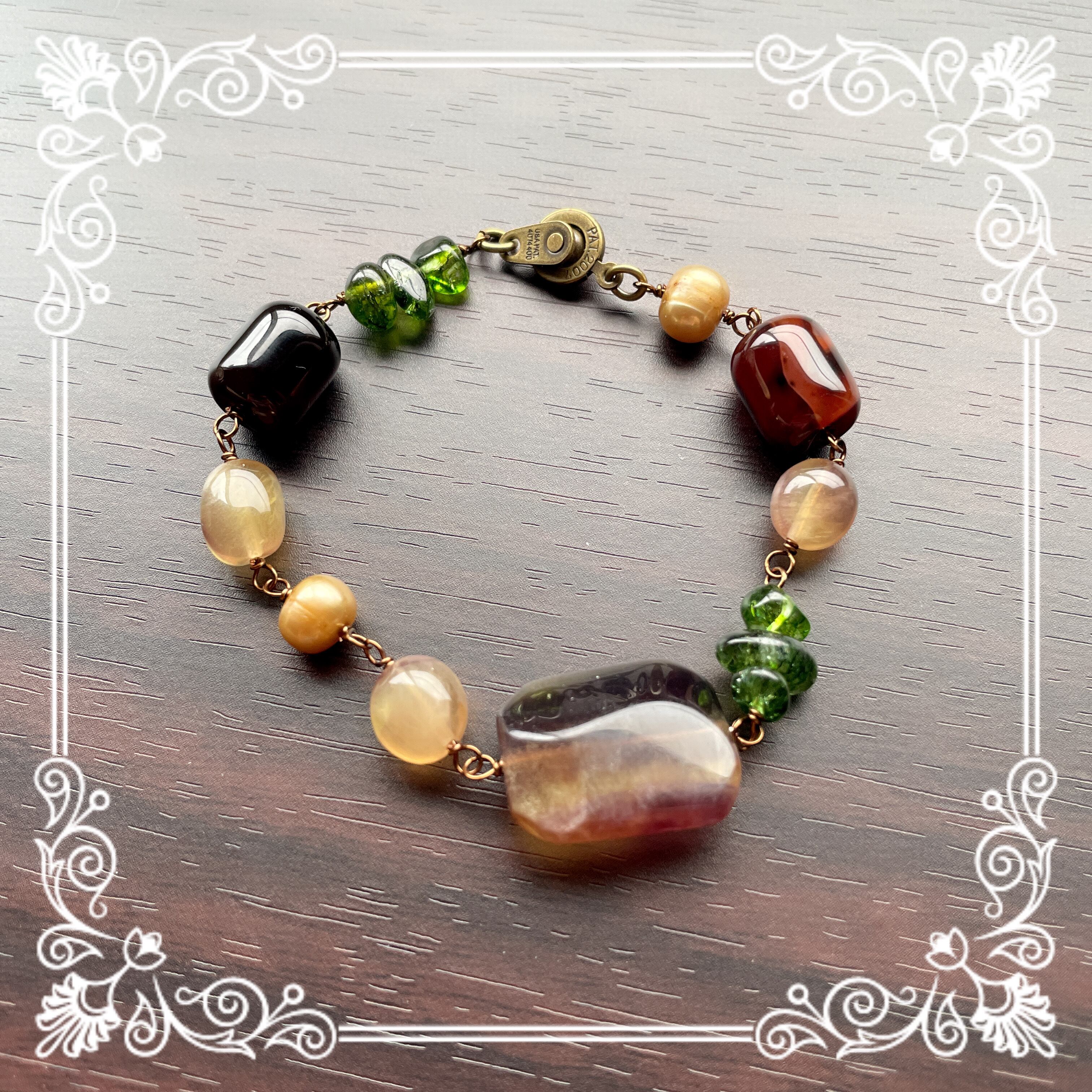大粒のフローライトは一つ一つグラデーションの違う一点もの。同系色ブラウンのタンブル、インパクトのあるブレスレットです。