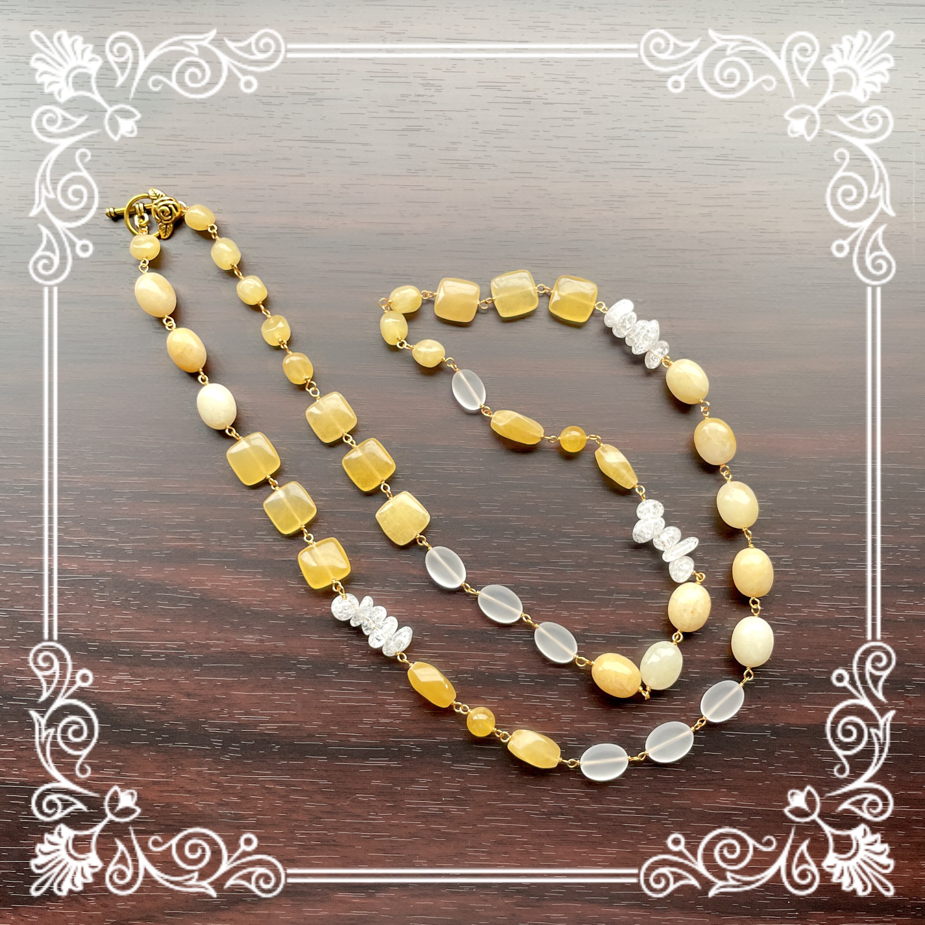 明るいイエローのカルサイトにハニーミルクカラーのイエロージェイド、2種類のクリスタル。