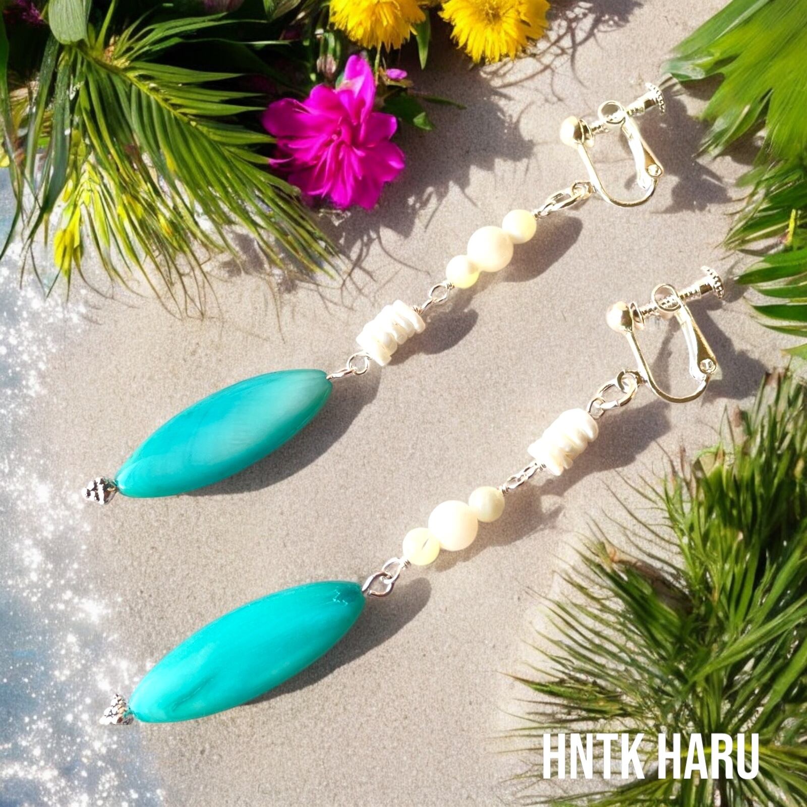 まるで海の世界を感じるような、ライトブルーとホワイトのコントラストが美しいデザインです。シェルとマザーオブパールの組み合わせは、上品さと華やかさを兼ね備えており、どんなコーディネートにもベストマッチ。シンプルなイヤリングなので、日常使いは勿論、特別なシーンでも活躍します。大人の女性にピッタリな一点ものアクセサリーです。