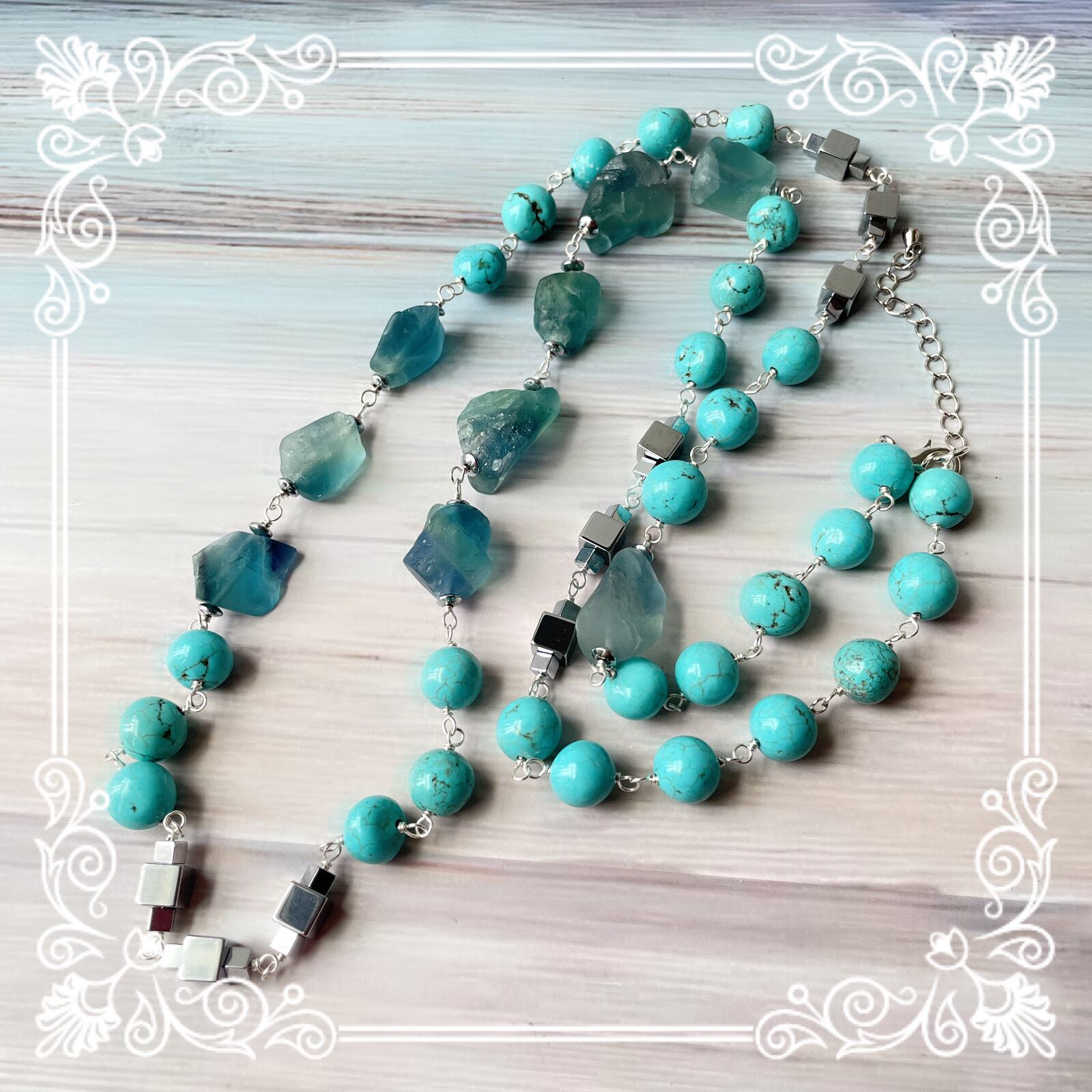 ブルーフローライトラフロックとマグネサイトターコイズを組み合わせた、上品なロングネックレスです。シルバーヘマタイトキューブがアクセントとなり、華やかさを添えています。存在感のある装いを演出できます。