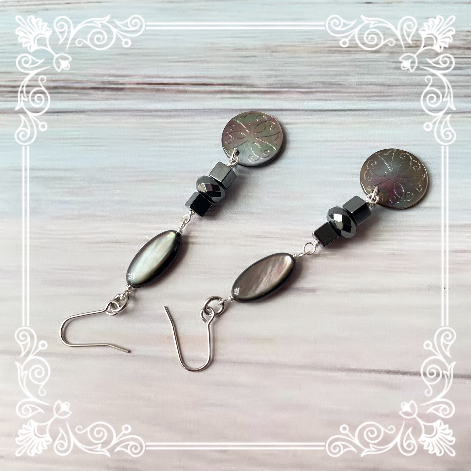 自然の美を感じることができるHNTKの黒蝶貝&ヘマタイトイヤリングピアス。繊細なデザインと上品な輝きが、女性の耳元を美しく飾ります。黒蝶貝とダークシルバーヘマタイトキューブの組み合わせは、大人の女性にふさわしい上品な印象を与えます。