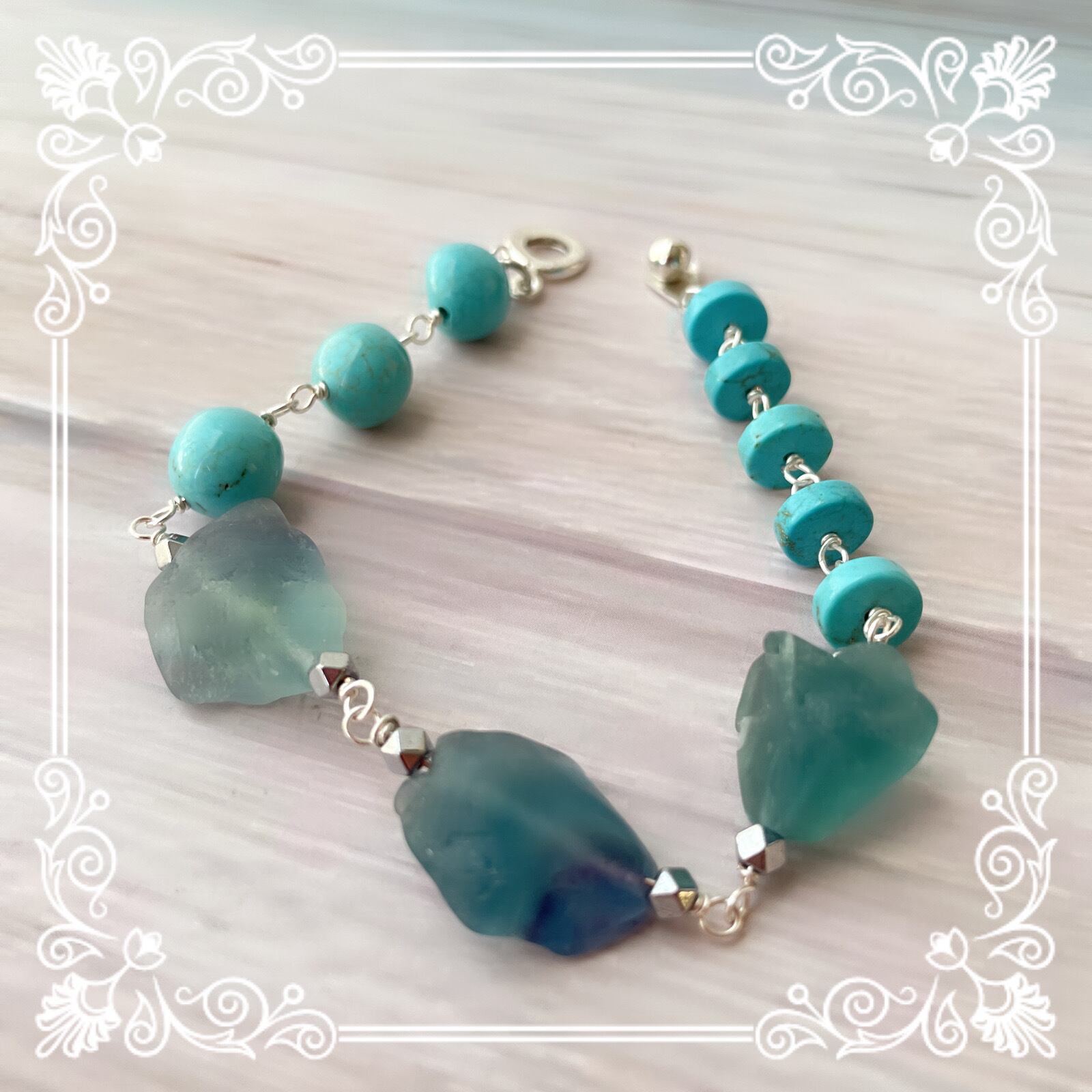 ラフロックフローライトブルーとマグネサイトターコイズの美しい組み合わせは、どんなコーディネートにもマッチすること間違いなしです。シルバーヘマタイトとの相性も抜群で、さらに存在感を引き立てます。