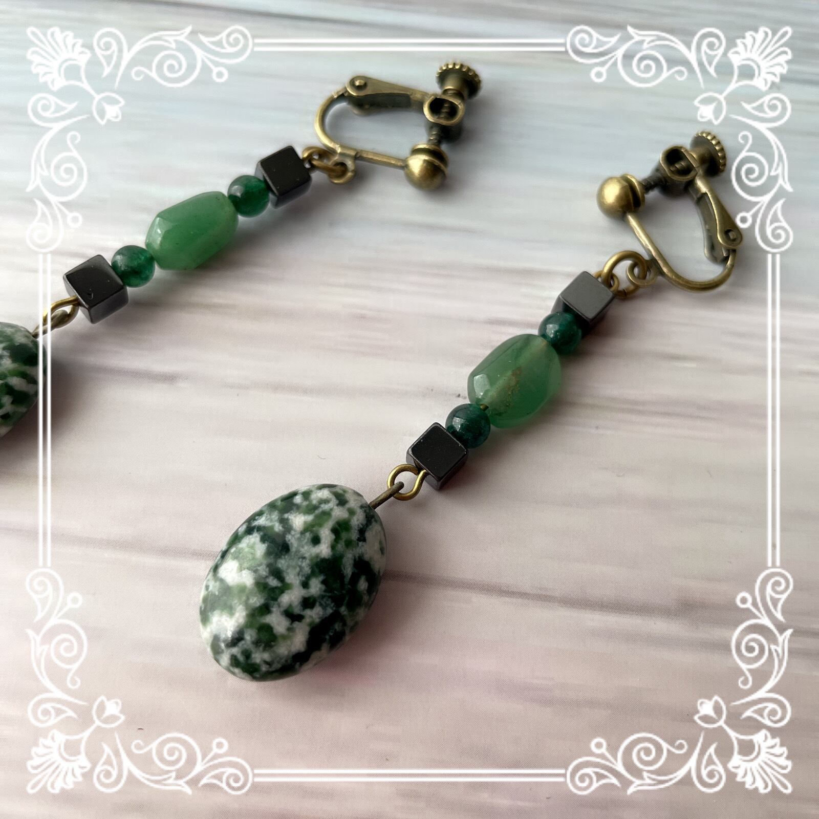 豊かな自然のパワーが宿る、HNTKのツリーアゲート&グリーンアベンチュリンイヤリングピアスです。石の美しさとエレガントなデザインが調和した一品は、上品でありながら個性的な魅力を放ちます。