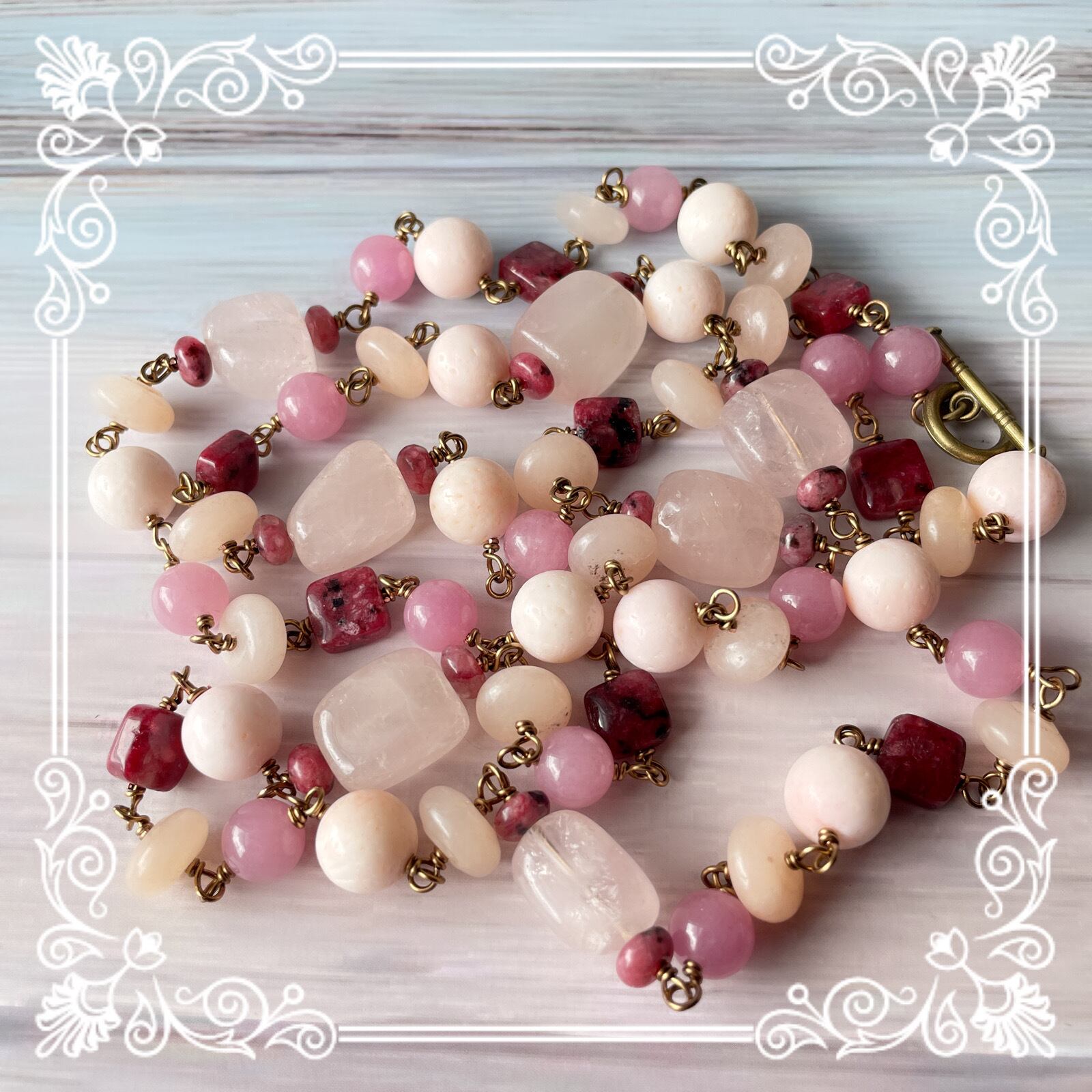 温かみのあるローズクォーツと、鮮やかなピンクキウイストーンが華やかなアクセントとなったロングネックレスです。