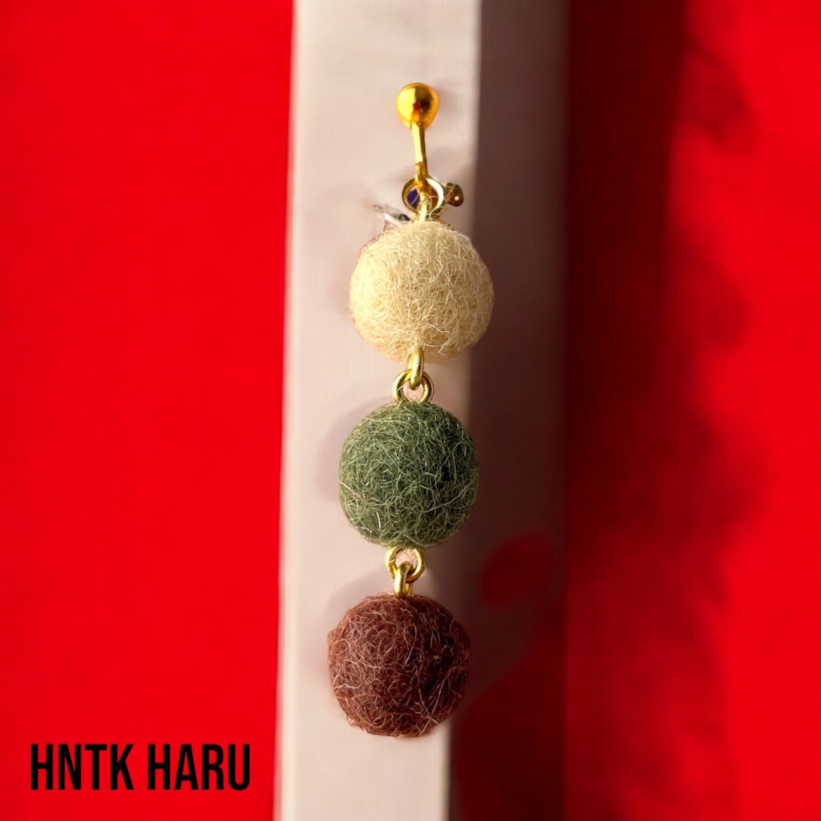 HNTK ブラウン&ベージュ&グリーン フェルトボール イヤリングorピアスは、3個のフェルトボールがコーディネートされたおしゃれなデザインです。