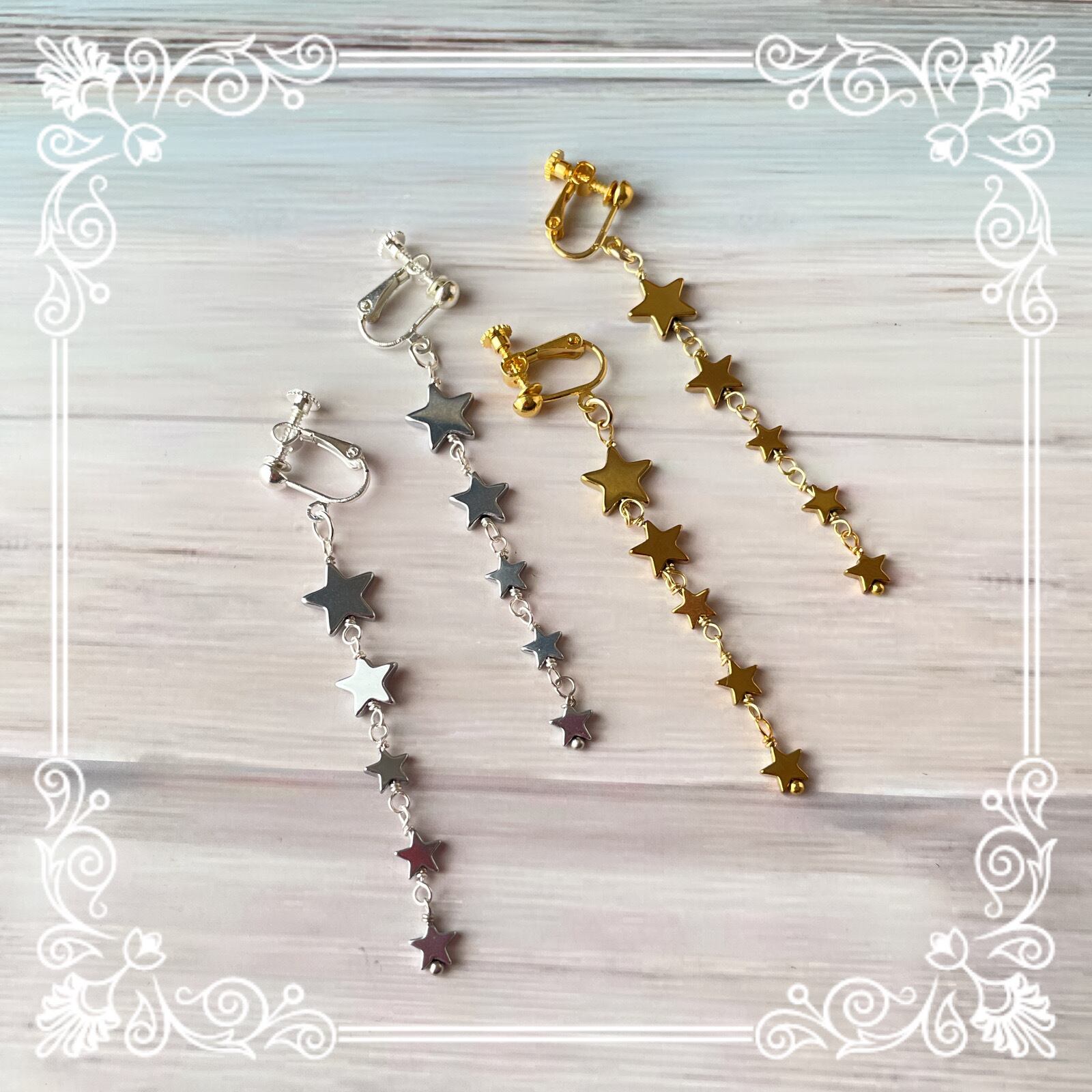 ゴールドカラーのゴージャスなイヤリングorピアスです。ヘマタイトのスターが5個連なっており、揺れるデザインがとても華やかです。
