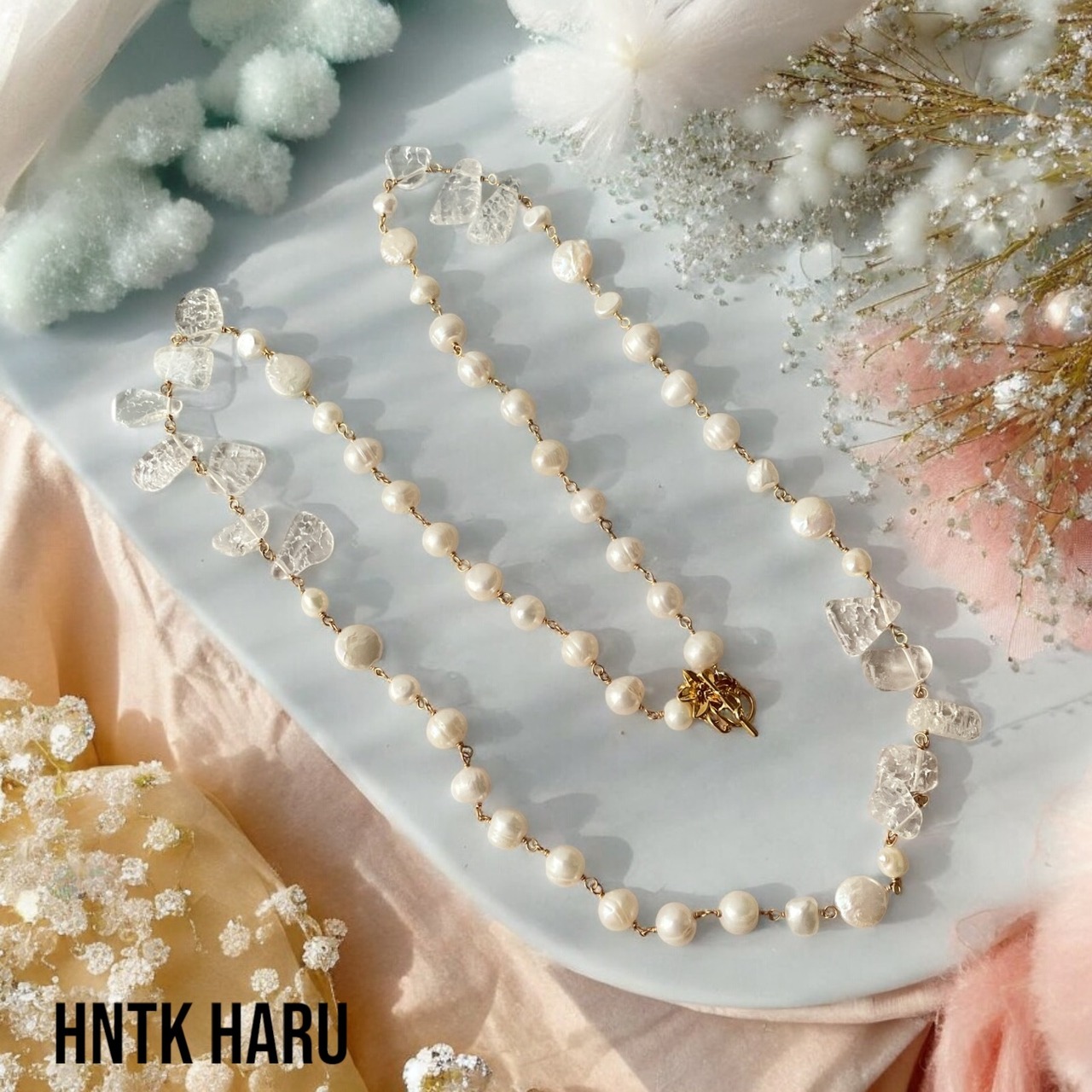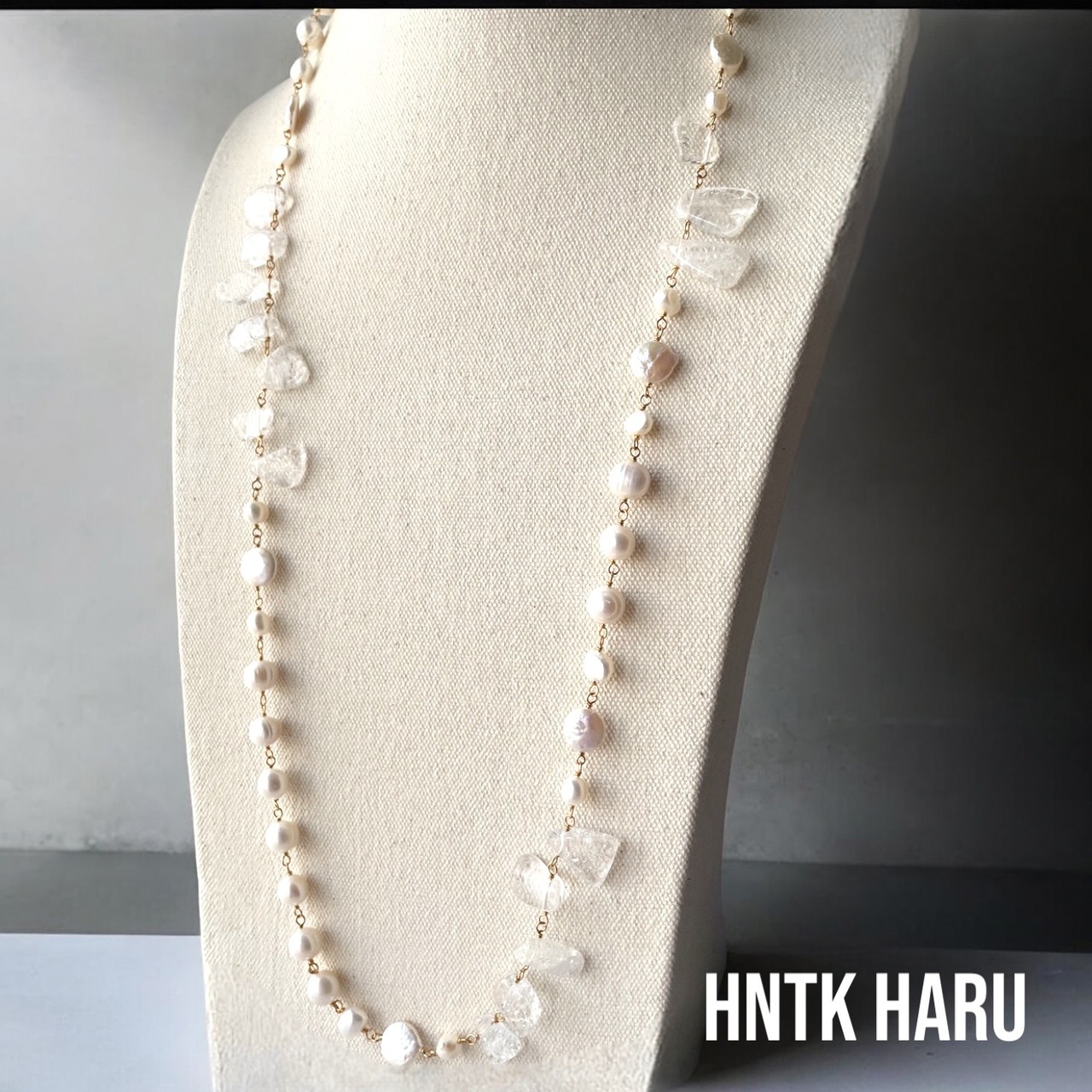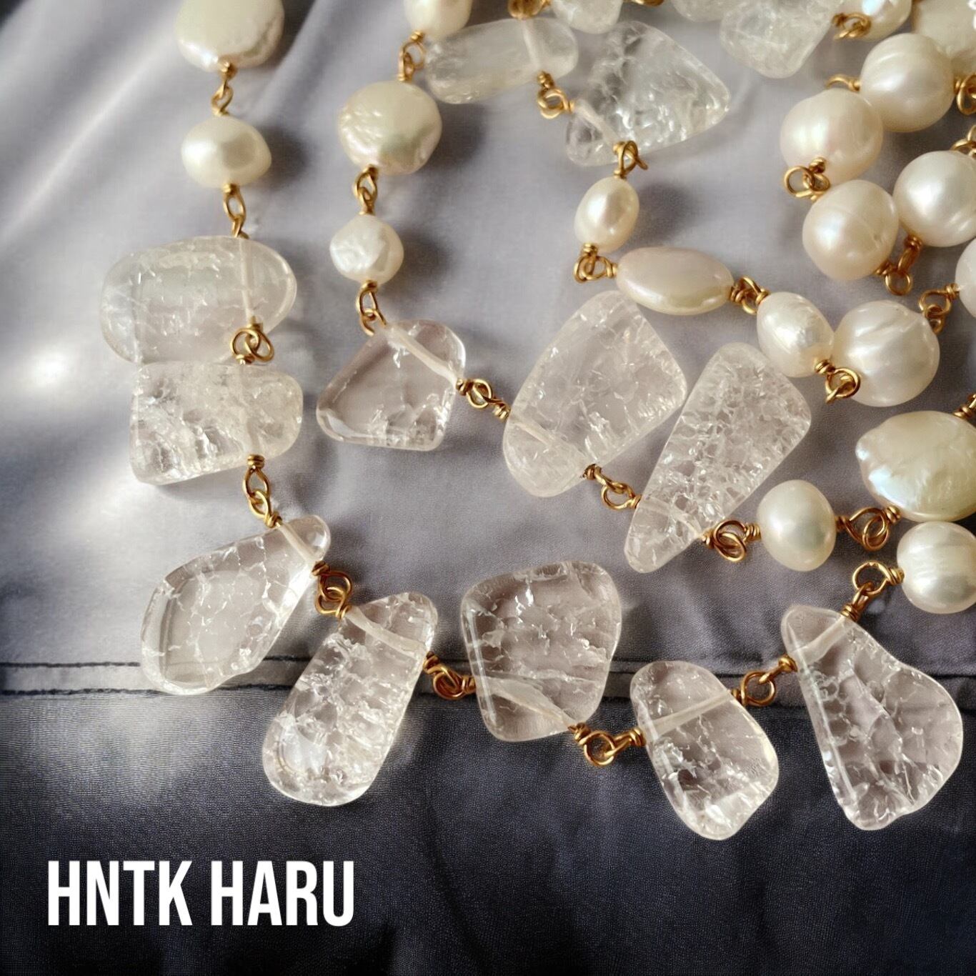 HNTK 大粒淡水パール&クラッククリスタル ロングネックレス N0665