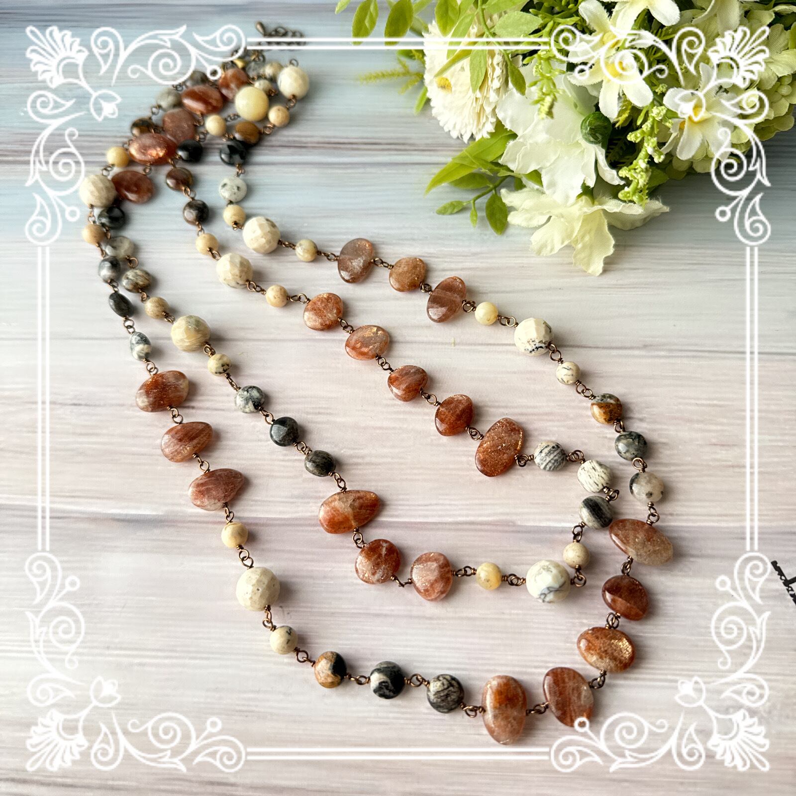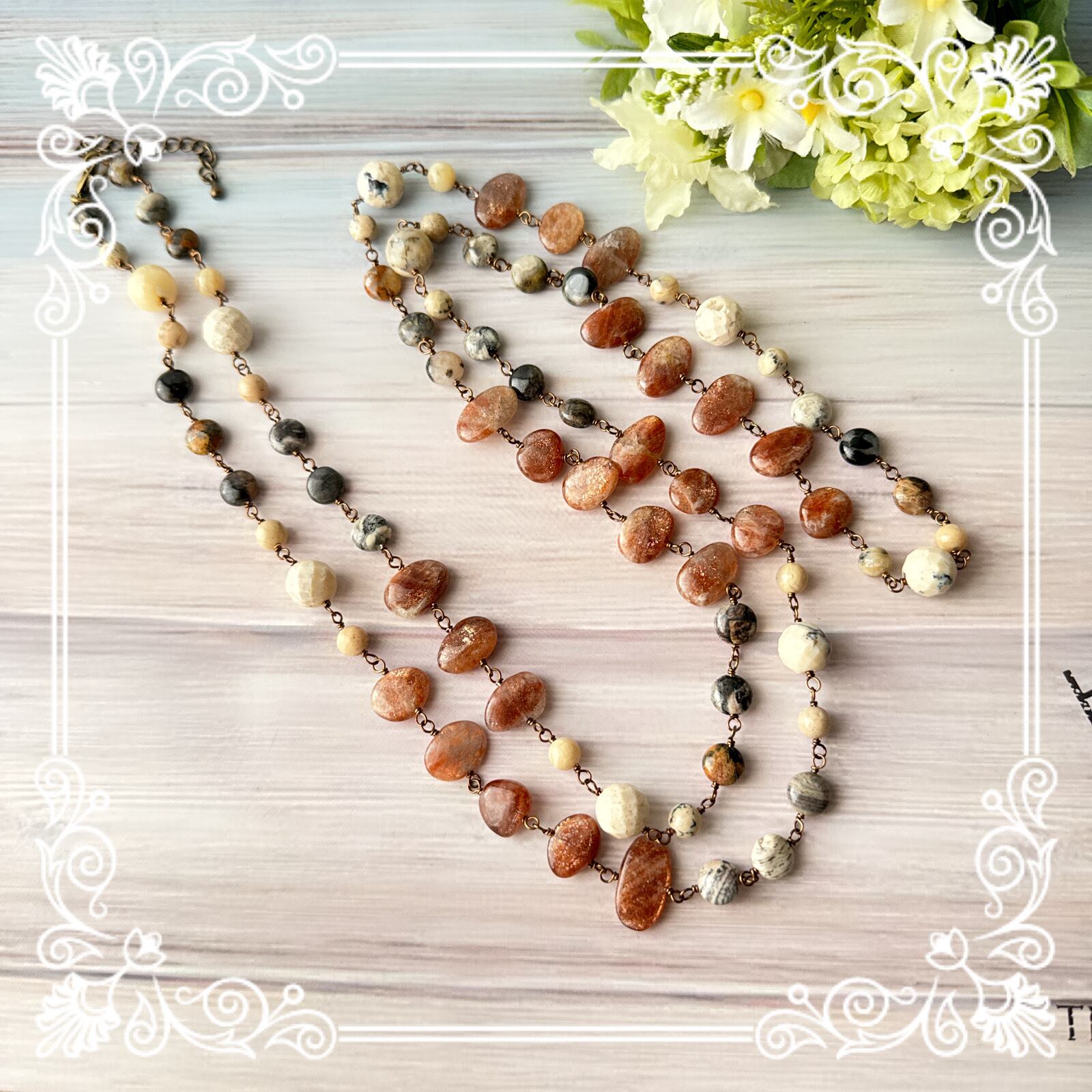 アフリカンオパールとブラウンムーンストーンが織りなす、上品でエレガントなロングネックレスです。アゲートの特徴である美しい模様が、アフリカンオパールとブラウンムーンストーンの輝きを一層引き立てます。ロングタイプのデザインなので、シンプルな服装にもよく映えるアクセントになります。デコルテを美しく演出することができます。