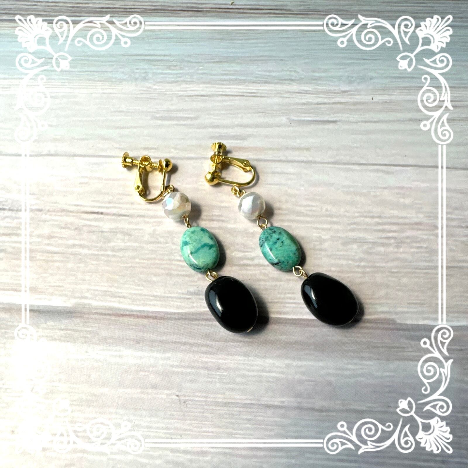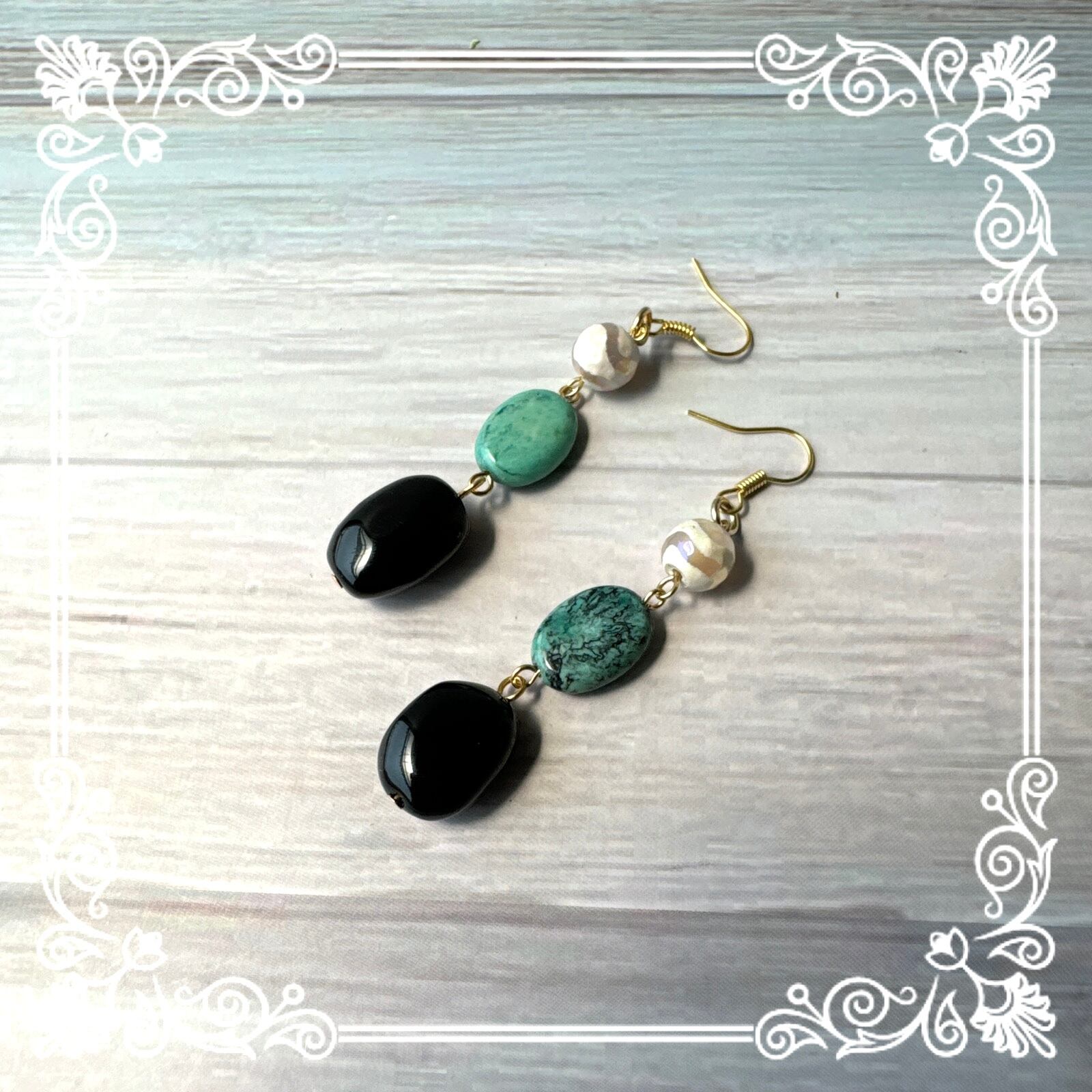 煌めく天然石が魅力のHNTKクリソコラ&オニキスイヤリングピアス選択P0344。クリソコラ、オニキス、ストライプアゲートの組み合わせが織り成す上品な輝きは、あなたの装いにエレガントさをプラスしてくれること間違いなし。