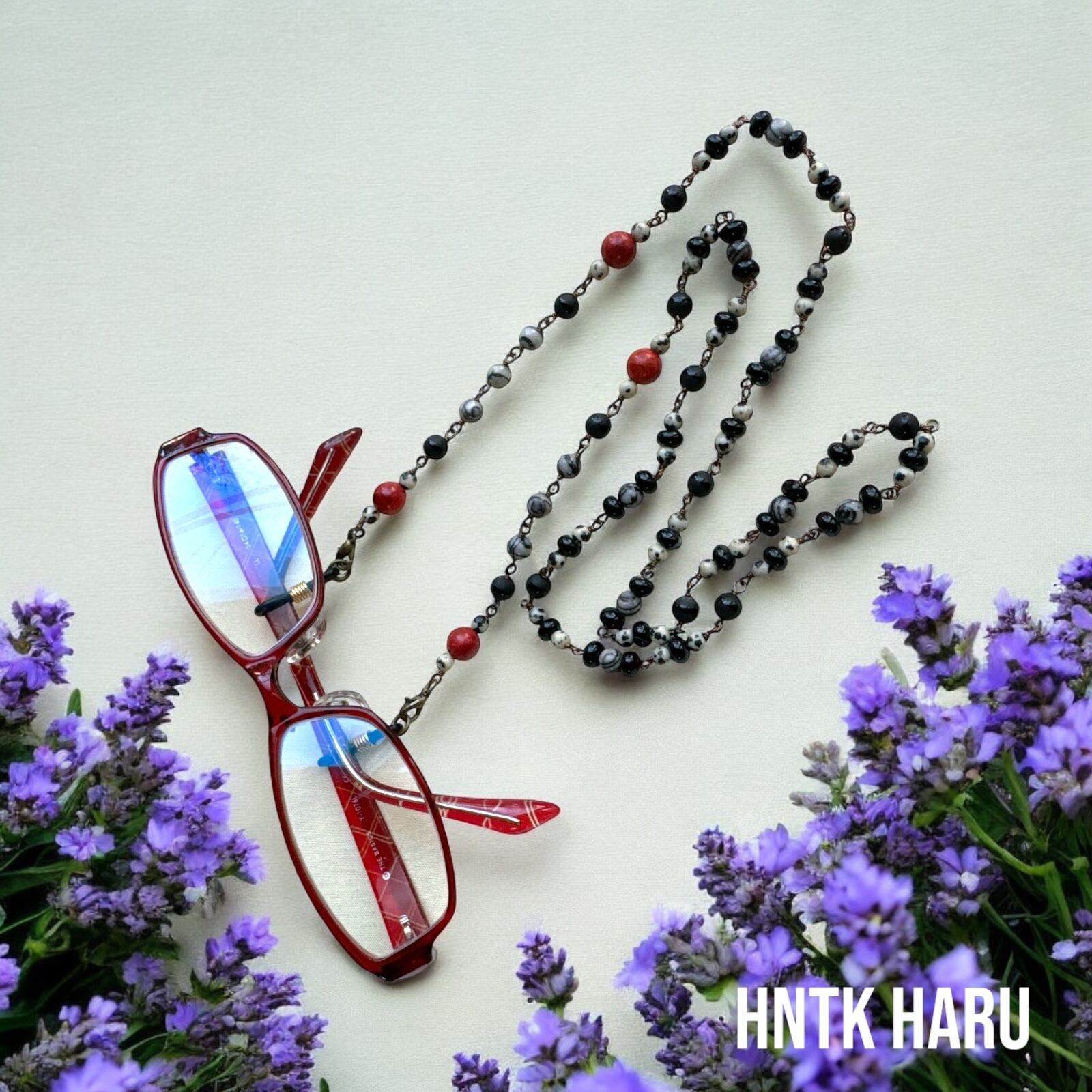 HNTK ダルメシアンジャスパー&レッドスポンジサンゴ 2wayネックレスメガネチェーン。洗練されたダルメシアンジャスパーと鮮やかなレッドスポンジサンゴを組み合わせた、個性溢れるアクセサリーです。どんなシーンでもおしゃれを楽しめる2wayネックレスとしてもお使いいただけます。