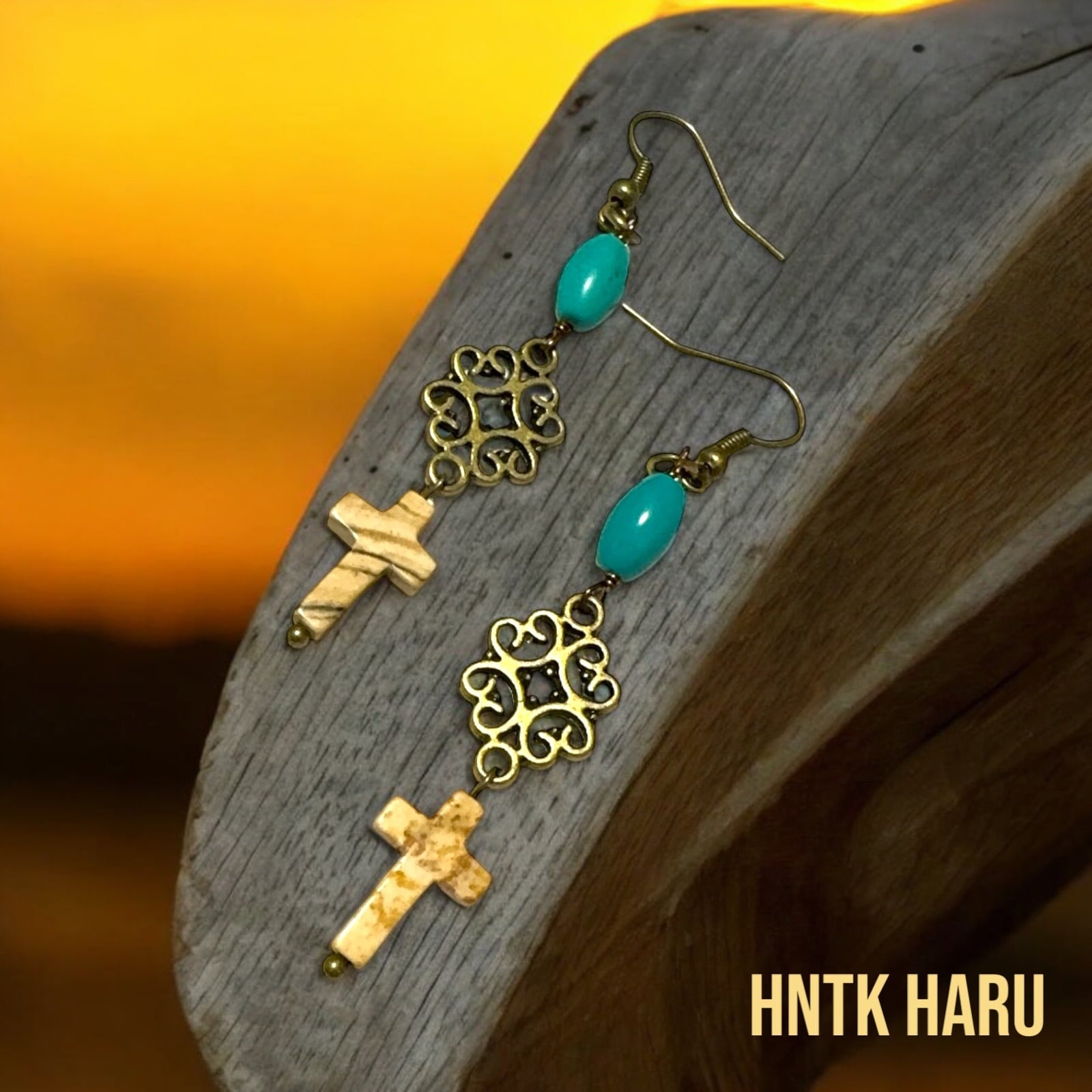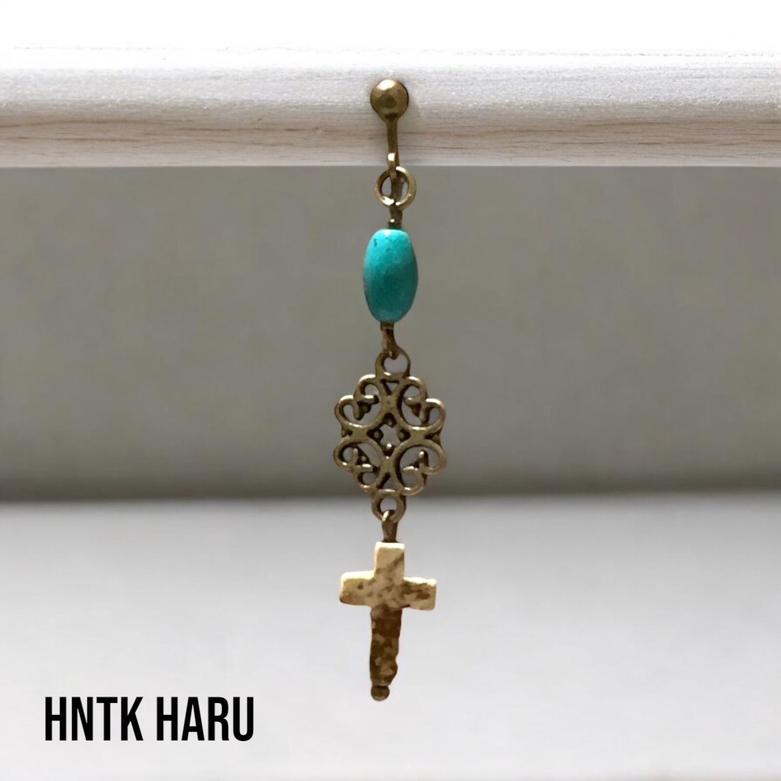 HNTK ピクチャージャスパー&マグネサイトターコイズイヤリングピアス選択 P0395は、ピクチャージャスパークロスとマグネサイトターコイズが絶妙に組み合わさったアンティーク風メタルのイヤリングピアスです。どちらの石も自然の美しさを存分に引き立て、コーディネートに華やかさをプラスしてくれます。個性的なデザインで、おしゃれなアクセサリーがお好きな方におすすめです