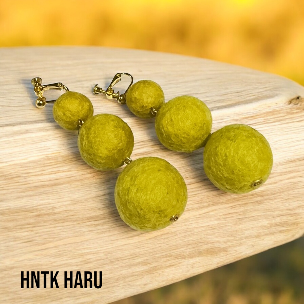 24㎜、20㎜、12㎜のフェルトボールがゆれるのがとても可愛く、存在感のあるイヤリングです。